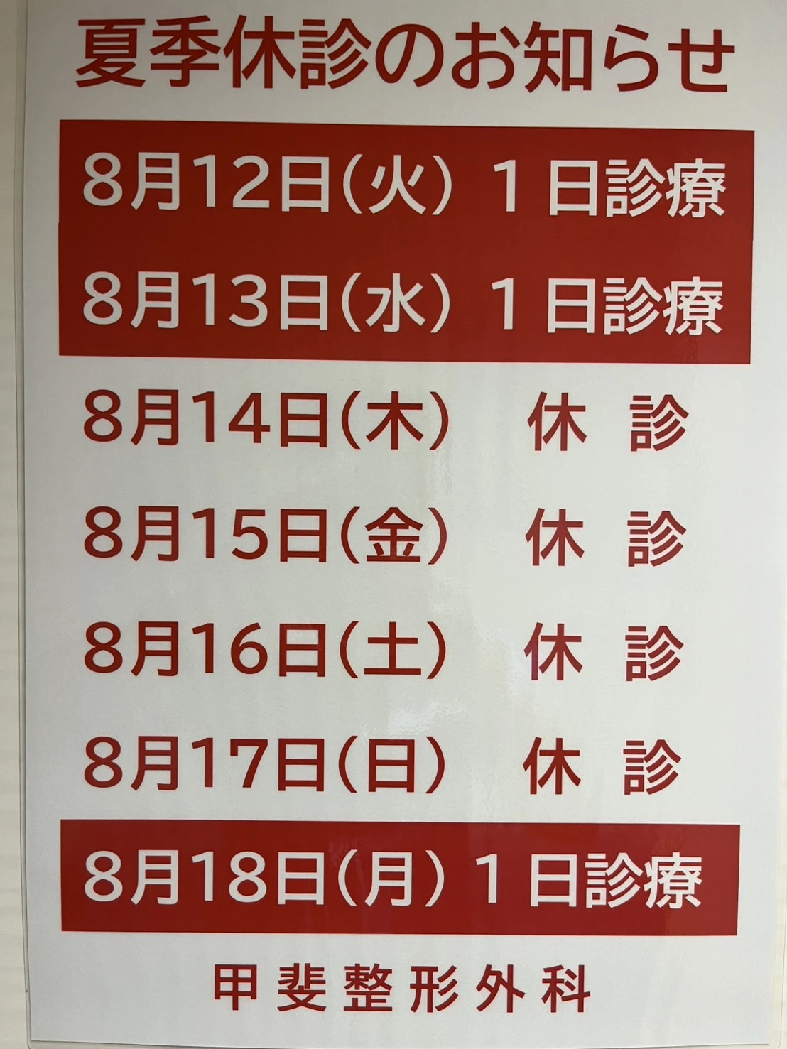 2025年夏季休診について│お知らせ|甲斐整形外科|熊本市の整形外科クリニック